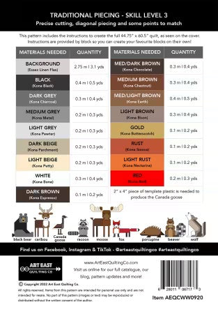 Wonderful Woodland includes complete instructions for making a 44in x 60”in quilt (as seen on the cover) or individual blocks for smaller projects. The individual blocks include: the moose block (24in x 24in finished), the bear block (15-1/2in x 18in finished), the beaver block (17-1/4in x 12-1/2in finished), the porcupine block (13-3/4in x 11in finished), the fox block (17-1/4in x 11-1/2in finished), the wolf block (15in x 18in finished), the racoon block (11-1/4in x 10in finished), the Canada goose (8-3/4in x 11in finished) and the caribou block (10-3/4in x 18in finished). This project is designed using conventional piecing techniques (no paper-piecing).