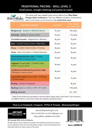 Catrobics—Cats Movin’ & Groovin includes complete instructions for making a 58” x 76” quilt (as seen on the cover) or individual cat blocks for smaller projects. The individual blocks range from 12” x 22” to 22” x 22” finished. The blocks are presented in a way that allows you to customize your cats easily in their poses and workout gear. This project is designed using conventional piecing techniques (no paper piecing).
