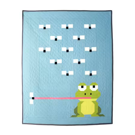 This pattern provides complete instructions for a 40 ½” x 50 ½” quilt, as seen on the cover, depicting a hungry frog catching flies. As a special bonus, instructions are included to transform your frog into a prince (no kiss needed)! The frog prince block, complete with a golden crown, finishes at 15 ½” x 19”. This project uses conventional piecing techniques (paper-piecing). With almost no points to match, this quilt is an excellent choice for beginners looking to try a precisely pieced project.