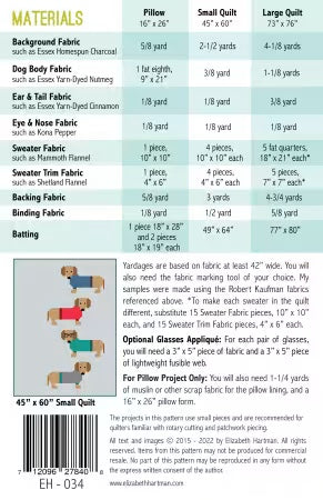Dogs in Sweaters includes instructions for making two quilt sizes and a 16” x 26” quilted pillow cover. These adorable dogs and their stylish sweaters are made using conventional patchwork techniques. No paper piecing! The pattern also includes a complete list of the cut pieces need to make a single block, making it easy to use scraps or make single blocks for other projects. Give your blocks even more personality with an optional glasses applique.