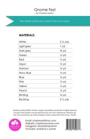 Discover the delightful world of gnome crafting with the Gnome Fest quilt pattern, perfect for both B2B and B2C enthusiasts. This enchanting design features a variety of gnomes, each adorned with colorful, star-patterned hats in shades of red, blue, green, and more, set against a charming cream background. The quilt is rotary pieced with a few templates, making it an easy and enjoyable project to construct. Measuring 50" x 60", this quilt is ideal for adding a whimsical touch to any space. The pattern includes detailed instructions for creating this 50" x 60" quilt, using a palette of white, light grey, dark grey, red, green, aqua, maroon, navy blue, pink, yellow, peach, and binding and backing materials.
