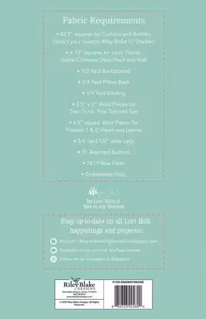 The Granny's House Pillow by Lori Holt of Bee in my Bonnet features a pieced cottage, wool applique, and button embellishment. The pillow uses a 5" stacker with additional yardage. Finished size is 24in x 24in.