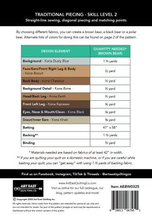 This traditionally pieced pattern features a resting bear against a classic Bear Paw quilt block backdrop. The finished quilt measures 40 ½” x 51 ¾”. Perfect for advanced beginners, this pattern offers practice in straight-line sewing, diagonal piecing, half-square triangles, and matching points. Select your fabrics to create a brown, black, or polar bear. Suggested fabric choices are included for each option. Pattern Details: Finished Size: 40 ½” x 51 ¾” Techniques: Traditional Piecing Skill Level: 2 - Advanced Beginner Skills Required: Straight-line sewing, diagonal piecing, and points to match Features: Cutting guide fabric layouts are included to make the most of your fabric. Pattern Format: 16-page, 5 ½” x 8” booklet, saddle-stitched with a rigid cover.