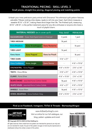 Dinorma T-Rex on Roller Skates Quilt Pattern From Art East Quilt Co - PAPER/PRINTED